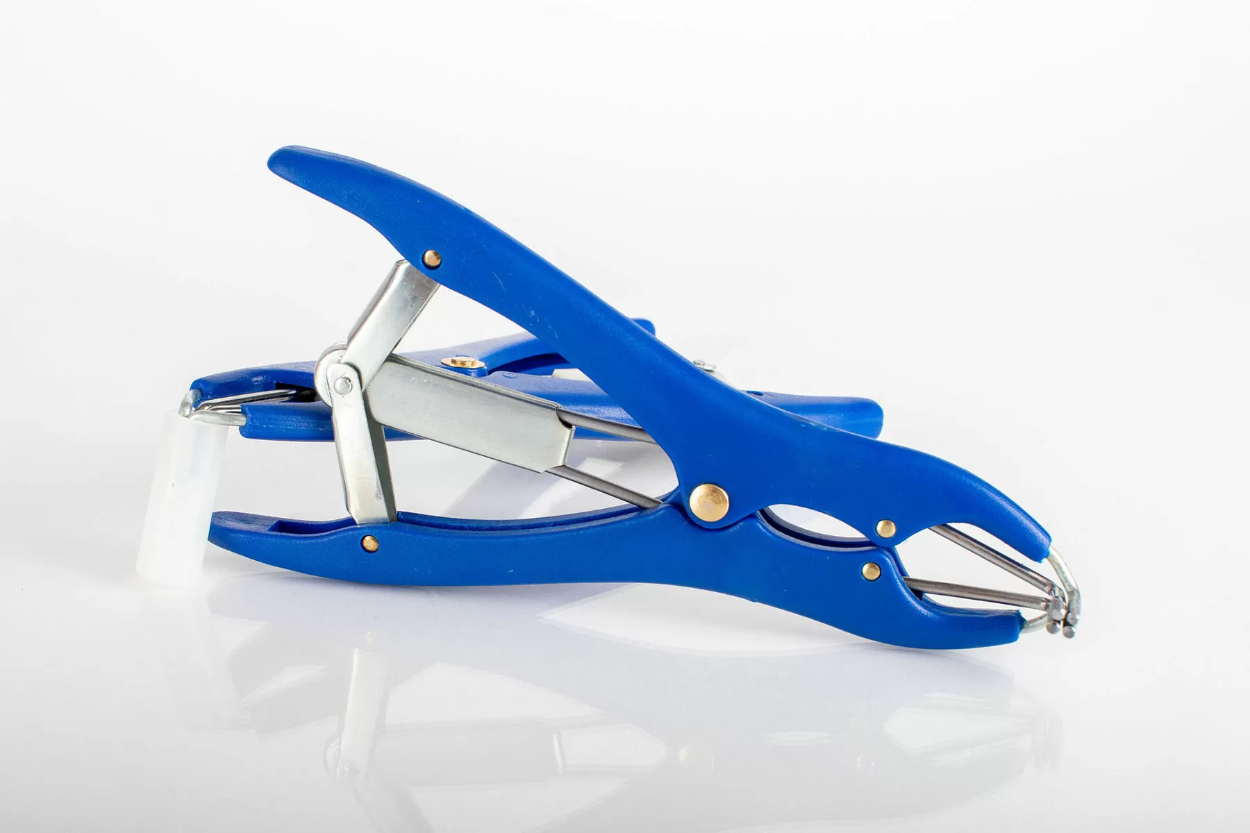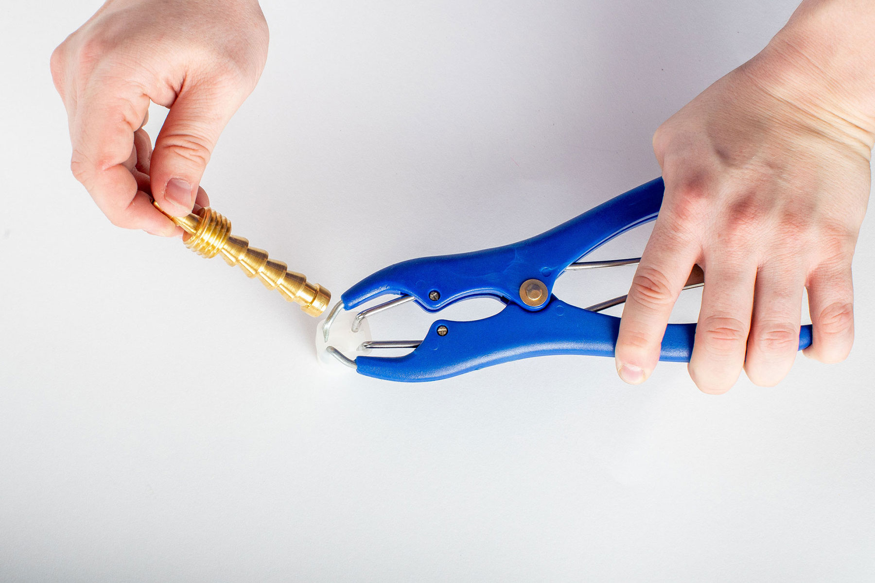 Thread the Vapor Pin® sampling device into a secure cover or the installation/extraction tool.  Insert the Prongs of the Elastrator into the sleeve.  Squeeze the Elastrator to open, and push the Vapor Pin® sampling device into the sleeve.