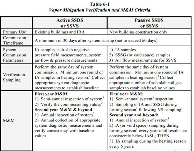 EPA’s OSWER 2015 guidance states that, “Once an adequate demonstration of effectiveness has been made for the vapor intrusion mitigation system, periodic monitoring is recommended to verify that this performance is sustained” They offer several state guidance documents, including California (2011), New Jersey (2014), and Massachusetts (2011) as examples of how one might accomplish this. New Jersey’s updated guidance (2016) recommends a combination of indoor-air testing and subslab vacuum measurements, as shown in their table, below: