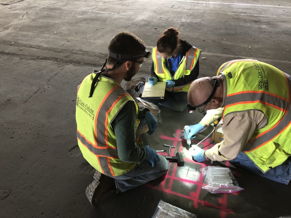Soil gas is usually analyzed with the same methods used for indoor air, which in the U.S., generally means EPA Method TO-15. TO-15 specifies Gas Chromatograph/Mass Spectrometer (GC/MS) analysis of samples from evacuated stainless-steel “Summa” canisters. But because soil-gas concentrations at source areas are so high relative to indoor air, smaller, less costly containers might also suffice. Disposable glass vials are easier to ship than canisters and cheaper, since they don’t have to be cleaned between samples. Cox-Colvin recently completed a source investigation at a multi-acre facility in Oklahoma that was slated for demolition. VI in the existing building was not a concern, but locating contaminated soil after demolition would have been costly. Instead, 4 people installed over 250 subslab sampling points in three days using hand-held equipment. All of the points were screened with field instruments, and 17 were selected for sampling and lab analysis. The picture below shows us using a disposable syringe to pull soil gas from a subslab point, prior to injecting it into a 22-milliliter glass vial. Because samples were analyzed by Gas Chromatograph (GC), which is more sensitive than the GC/MS, we were able to get relatively low reporting levels – too high for VI testing, but adequate to locate major vapor sources. We located a number of source areas; some were expected, some were not.